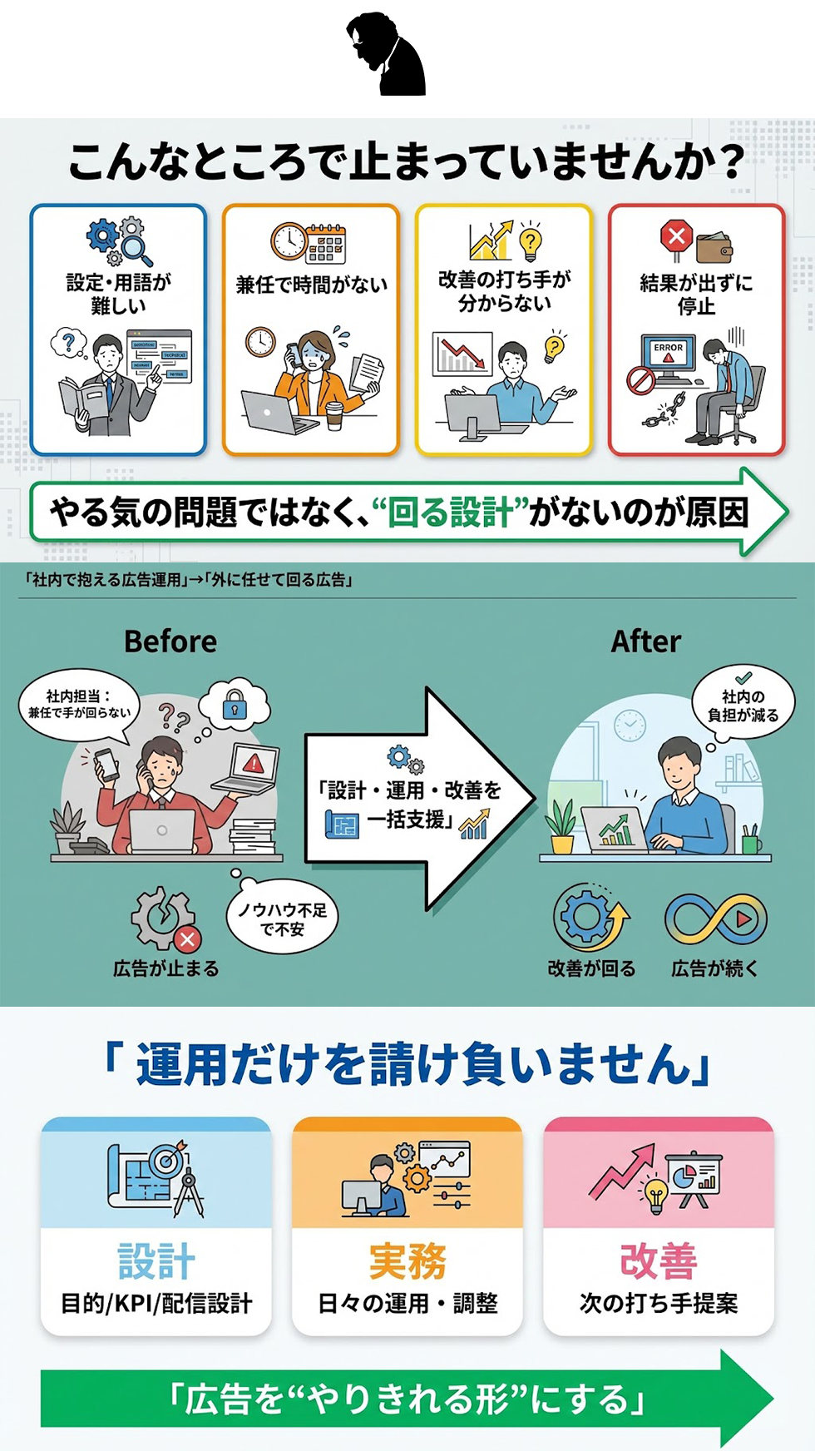 しかし、アドプラスの「運用ワンストップ型サービス」であればコミュニケーション面で、お客様に余計なお手間をかけることもありません。